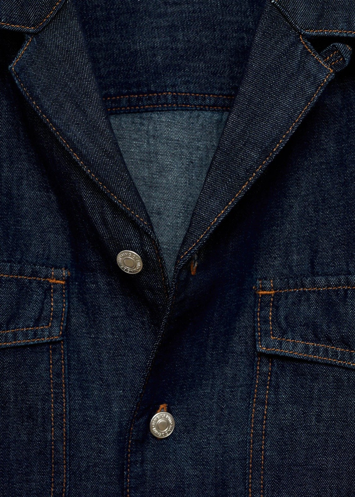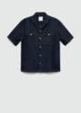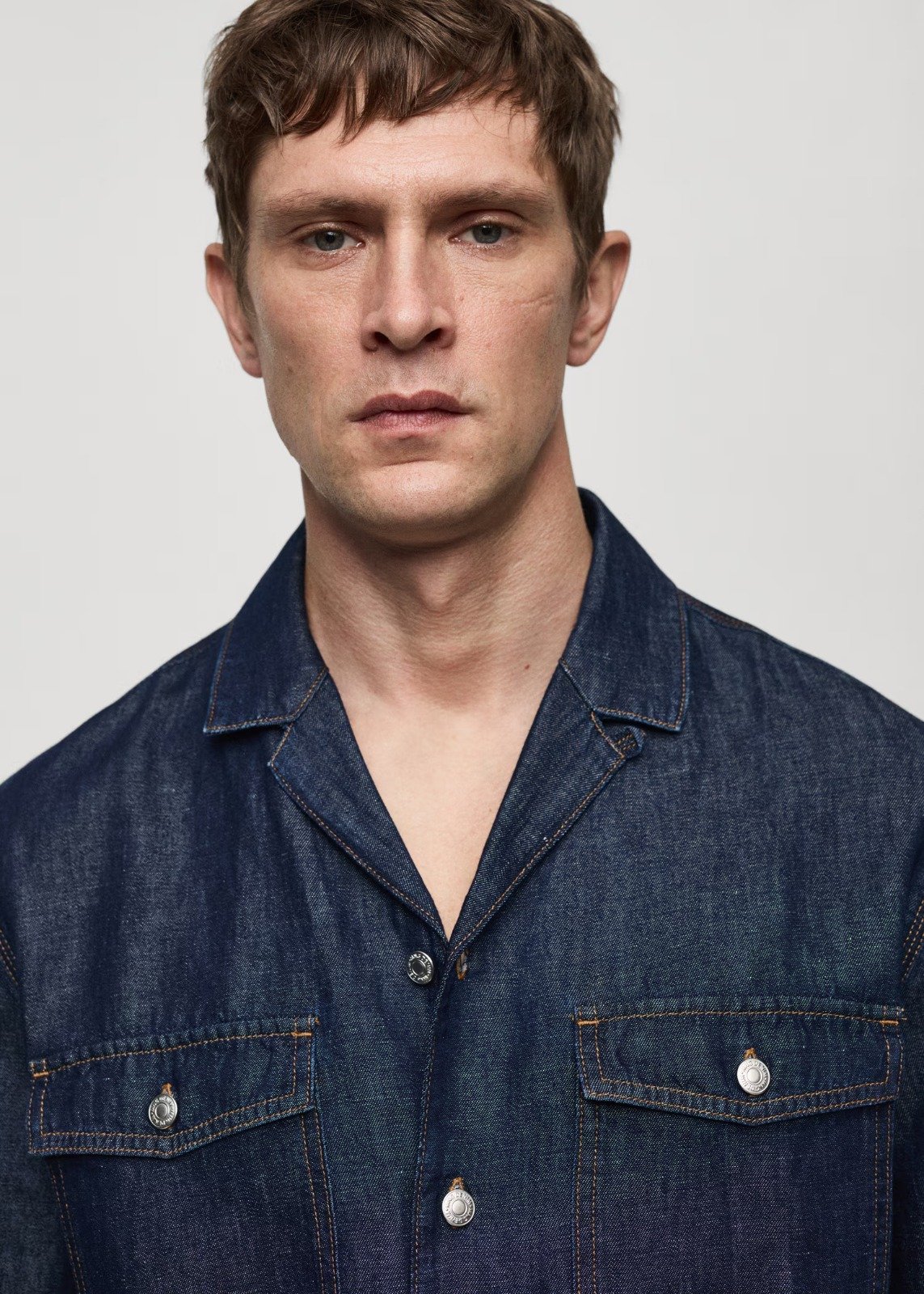 Crafted from a breathable cotton and linen blend in lightweight denim. Designed with a relaxed bowling collar and short sleeves for effortless ease. Features a front closure with metal buttons, two front flap patch pockets with button fastening, refined back-stitched detailing, and a clean straight hem.